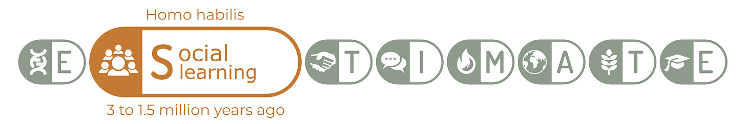 Humans uniquely form well-bonded groups—and cultures—around a successful tactic or strategy. Looking across the Working Origins timeline, the second marker, “Social Learning and Shame,” reflects the moderation of our primal emotions, states, and drives.